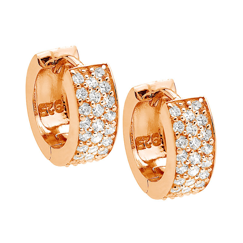 Sterling silver and rose gold plated wide huggie style earrings set with cubic zirconias.
