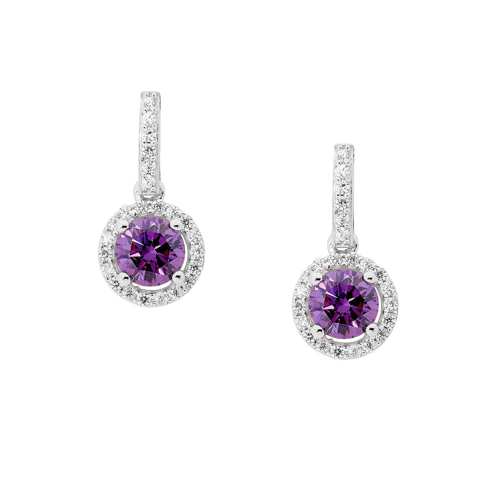 Sterling silver and purple cubic zirconia drop earrings with post and butterfly fittings.