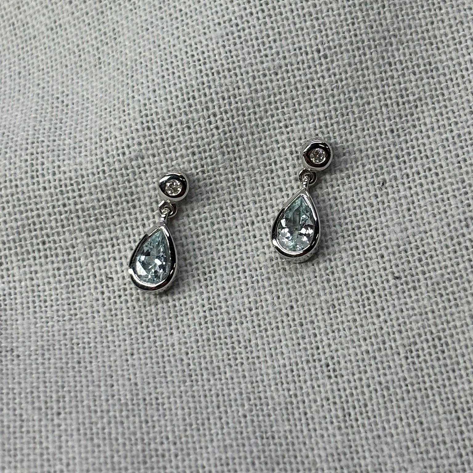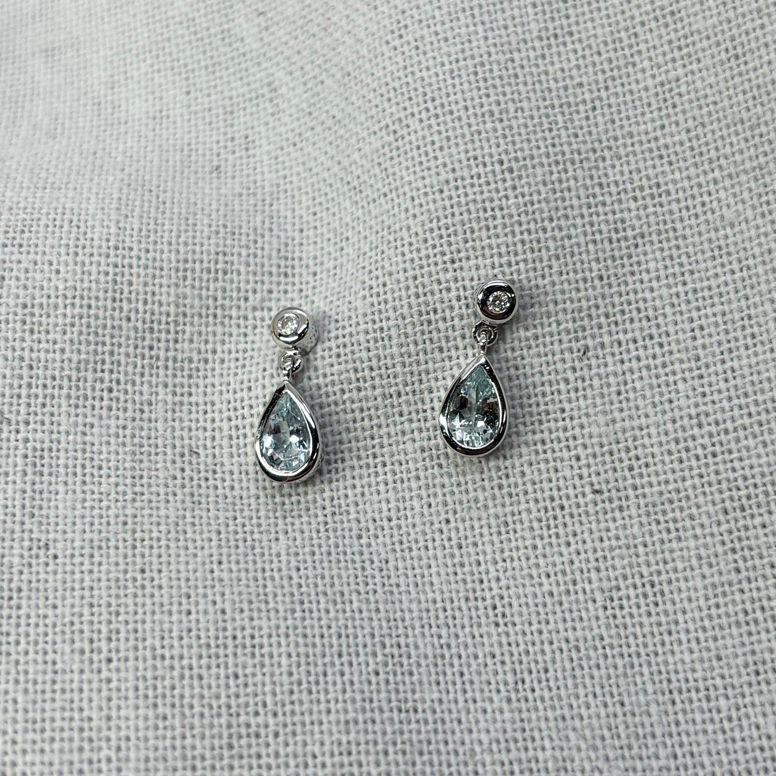 9ct White Gold stud style earrings bezel set with 6mm x 4mm pear-cut Aquamarines and diamonds.