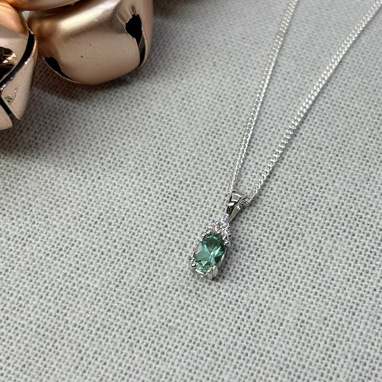 9ct White gold pendant claw set with a 6mm x 4mm oval-cut Green Tourmaline and 3=0.03ct round-cut G/VS diamonds. Pendant comes on sterling silver stock chain.