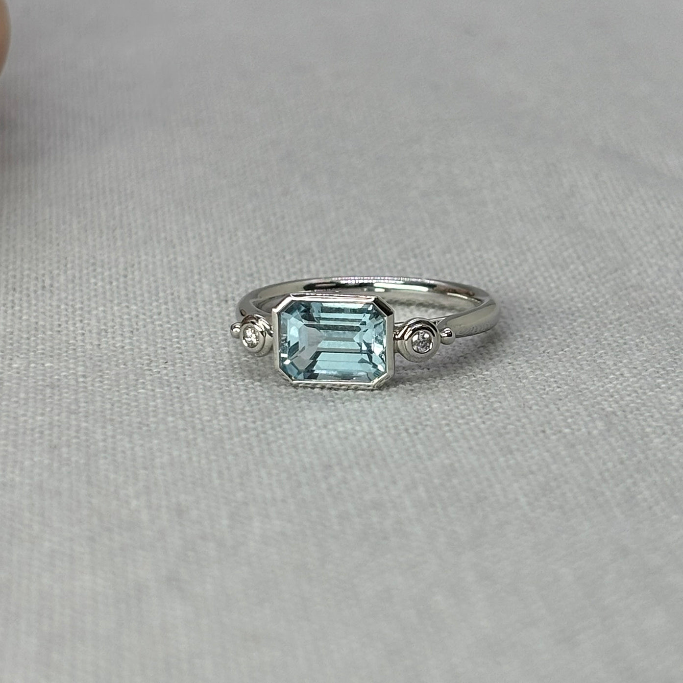 9ct White gold ring bezel set with an 8mm x 6mm emerald-cut blue Topaz and 2=0.04ct of round-cut H/SI diamonds