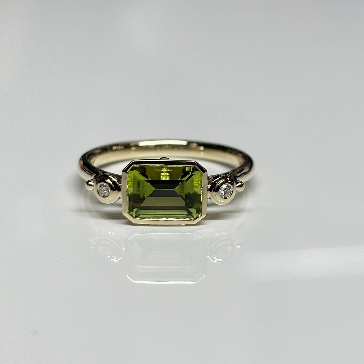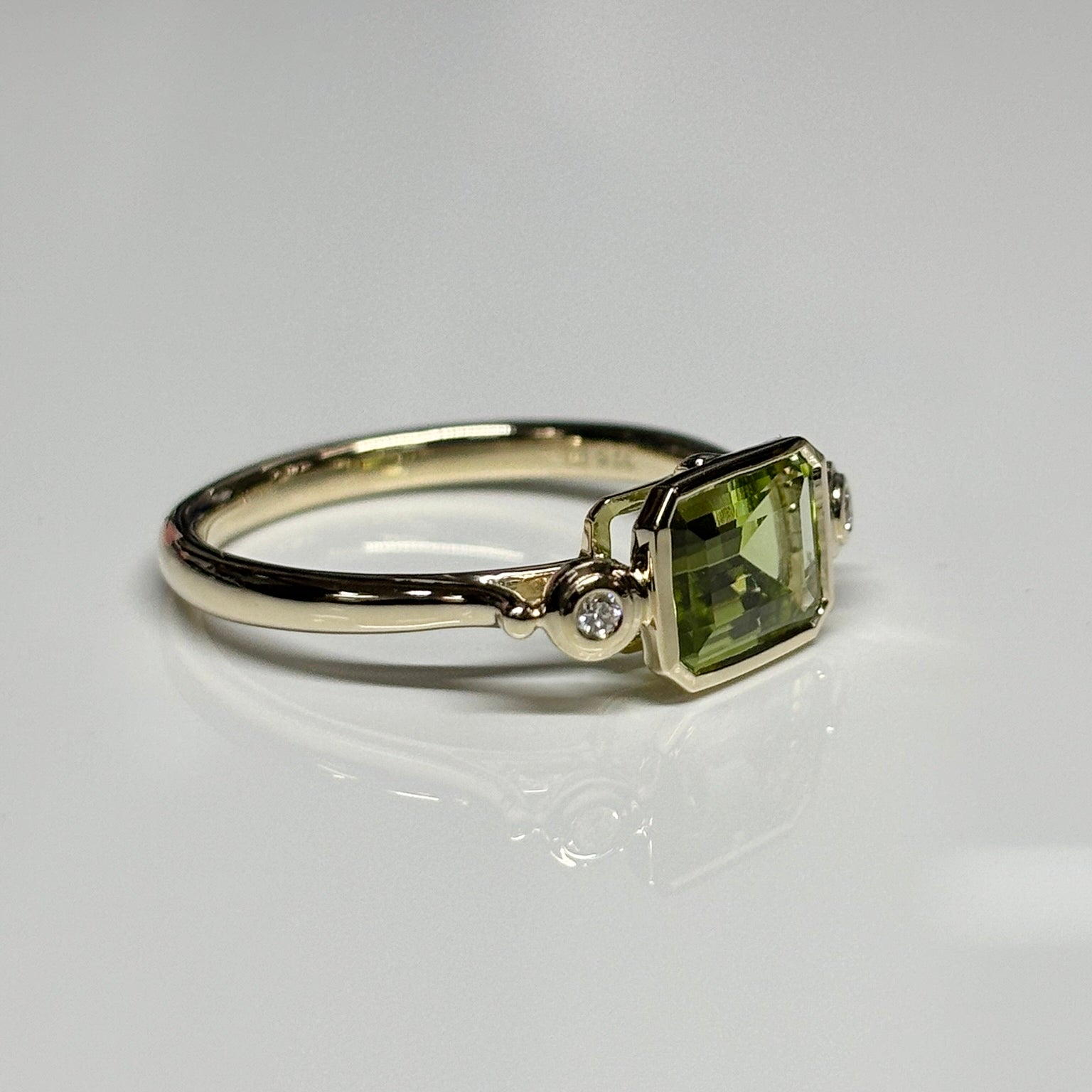 9ct Yellow gold ring bezel set with an 8mm x 6mm emerald-cut Peridot and 2=0.03ct round-cut G/VS diamonds.