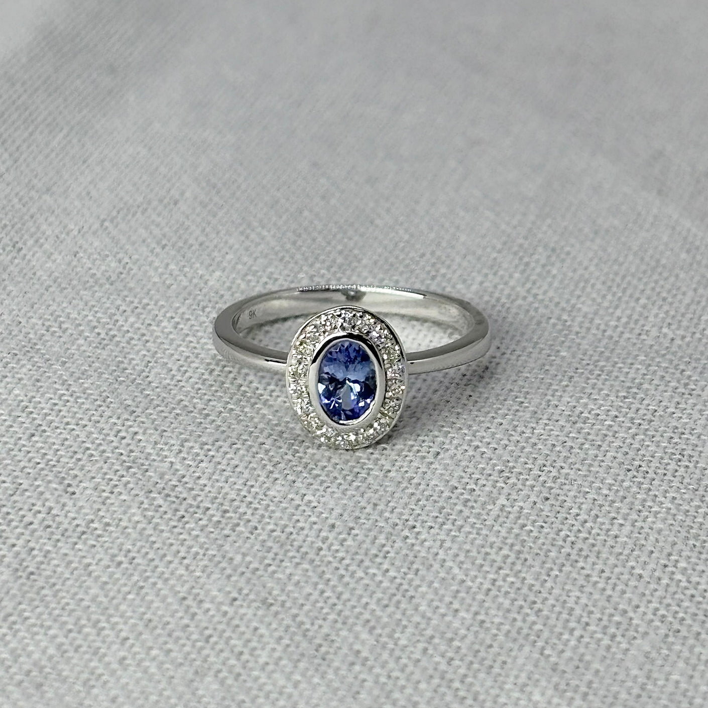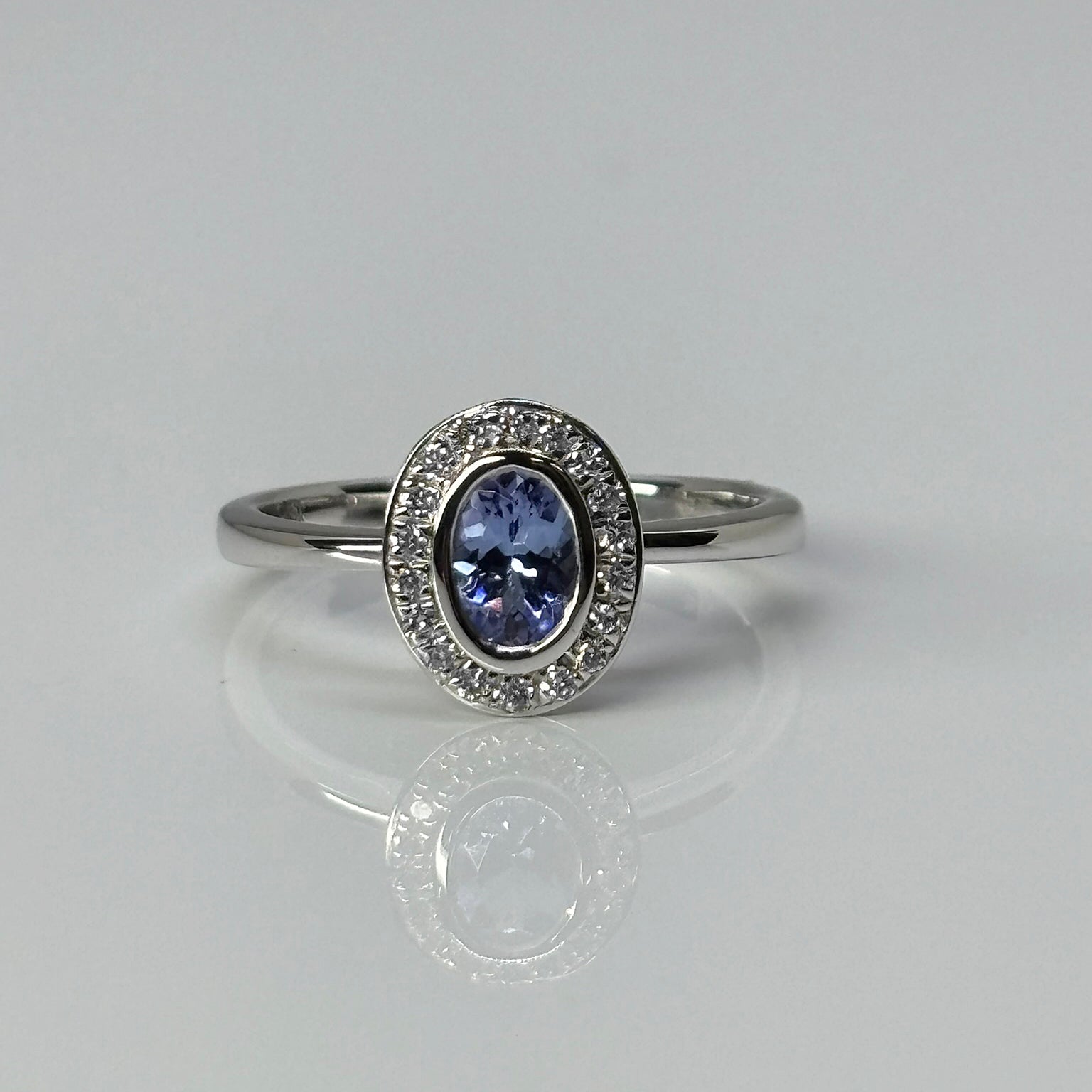 9ct White gold ring bezel set with a 0.44ct Oval-cut Tanzanite and bead set with 18=0.16ct round-cut G/SI diamonds.