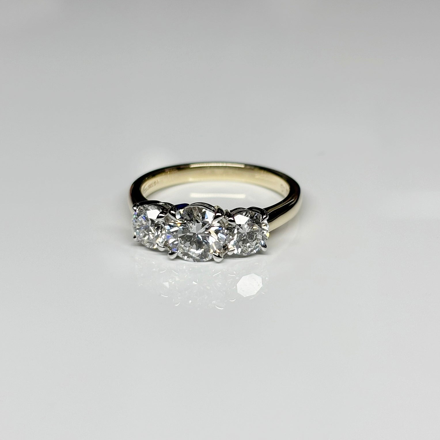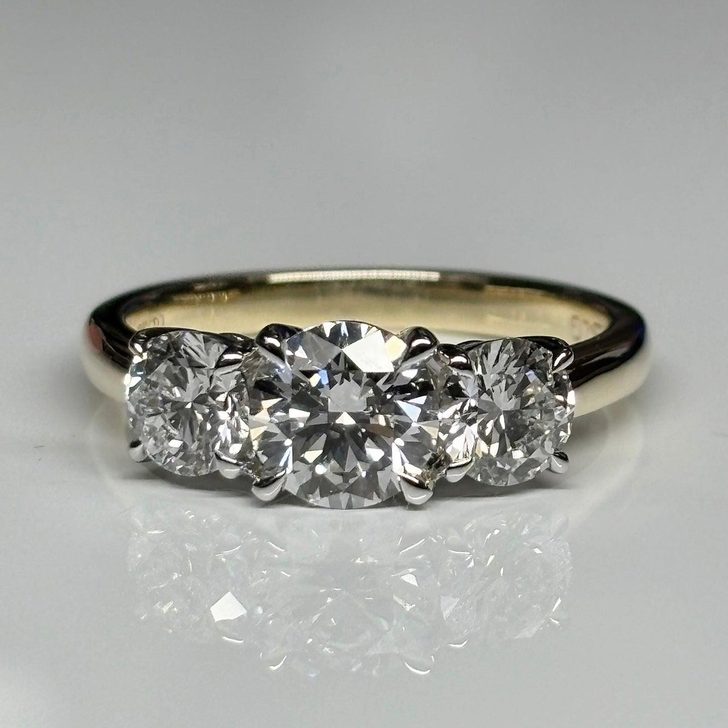 9ct Yellow and White gold trilogy style ring claw set with 1=1.00ct and 2=1.00ct round brilliant-cut Lab grown diamonds (DEF/VS).